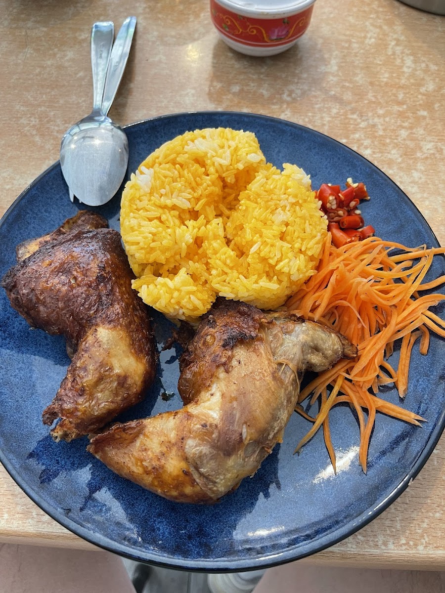 Crispy Skin Chicken and Tomato Rice: A perfect balance of textures, with crispy chicken paired with soft, fragrant tomato rice.